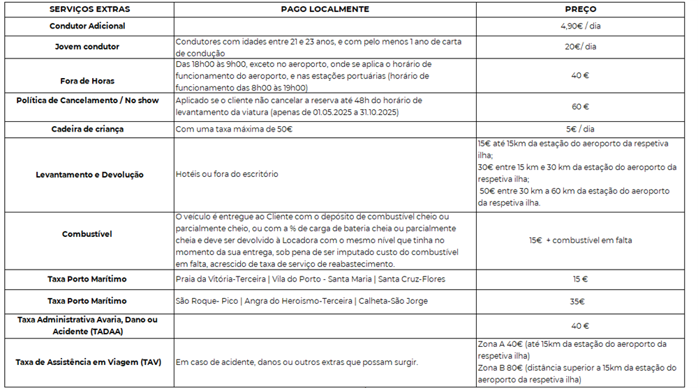 b) Serviços extras e equipamentos adicionais, tais como: Cadeira de Bebé/Assento, GPS, equipamento Wi-Fi conforme tarifa em vigor;